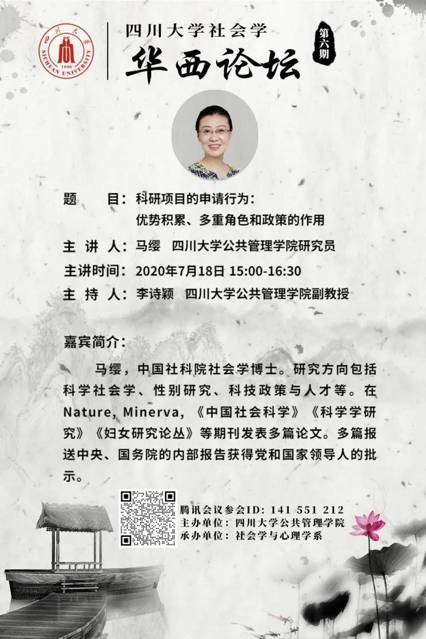 2020年7月18日下午15:00,det365登录网站主页社会学华西论坛云系列讲座第六期于线上成功举行。det365登录网站主页社会学与心理学系马缨研究员发表了题为“科研项目的申请行为:优势积累、多重角色和政策的作用”的精彩演讲。讲座由社会学与心理学系李诗颖副教授主持,百余名来自我校和省内外兄弟院校的师生参加了讲座。
