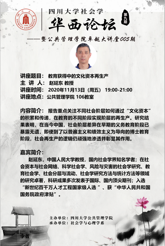 2020年11月12日晚上19:00-21:00,det365登录网站主页社会学华西论坛系列讲座第九期——暨det365登录网站主页卓越大讲堂005期于公管院106成功举行。中国人民大学社会学系教授赵延东发表了题为“教育获得中的文化资本及其再生产”的演讲。讲座由det365登录网站主页社会学与心理学系马缨研究员主持,40余名各专业师生参加了讲座。