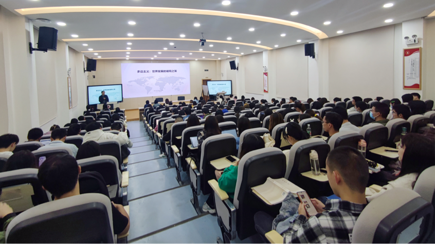 杨磊老师围绕课程主题,利用图片、案例、数据多形式,兼以幽默诙谐的语言风格,向同学们深入浅出地分析了世界局势与中国行动,让同学们学习到多边主义的深刻内涵、认识到青年学生应秉持的正确态度与应承担的时代责任。第一次综合素质课在同学们的热烈掌声中结束。
