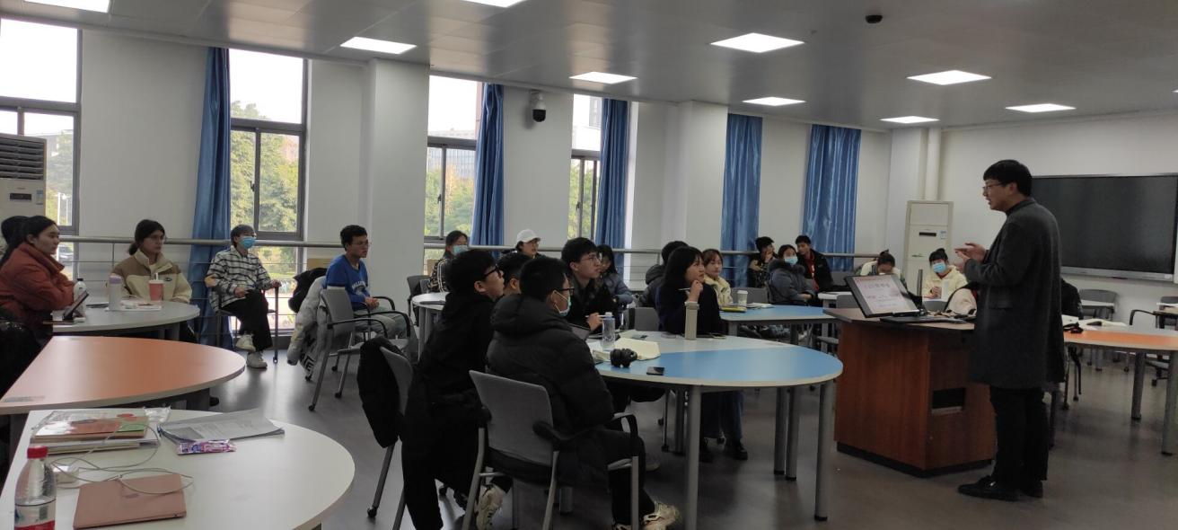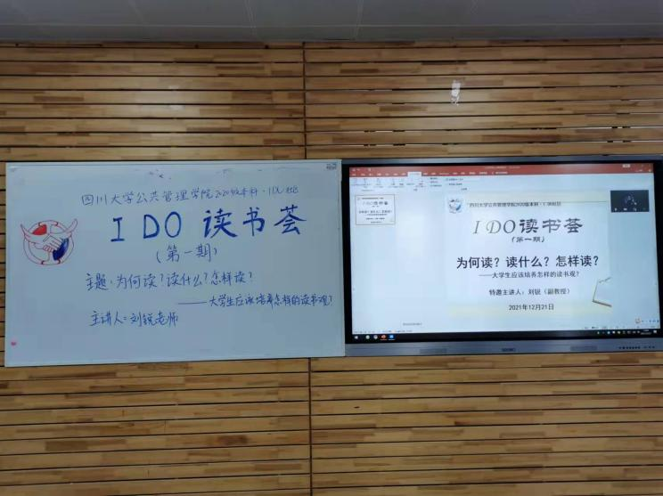 2021年12月21日14:30,det365登录网站主页2020级本科第一期“IDO读书荟”在江安校区基础教学楼D203教室成功举办。det365登录网站主页行政管理系刘锐副教授作为特邀嘉宾主讲了本次读书荟,读书荟由2020级本科辅导员苟欢老师主持,2020级本科学生各专业同学通过线下线上的方式参加了本次读书荟。