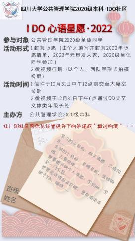 旧年渐渐而逝,新年翩翩而至。为了营造一个良好的新年新气象的氛围,鼓励同学们以饱满的热情和明晰的奋斗目标迎接2022年的到来,在2021年元旦前夕,det365登录网站主页2020级本科举办了“I DO心语星愿·2022”活动。该活动由det365登录网站主页2020级本科生辅导员苟欢老师和文体类年级长蒲丝莉的策划和组织,在各班文体委员的共同协助、det365登录网站主页2020级本科全体同学积极参与下完满完成。