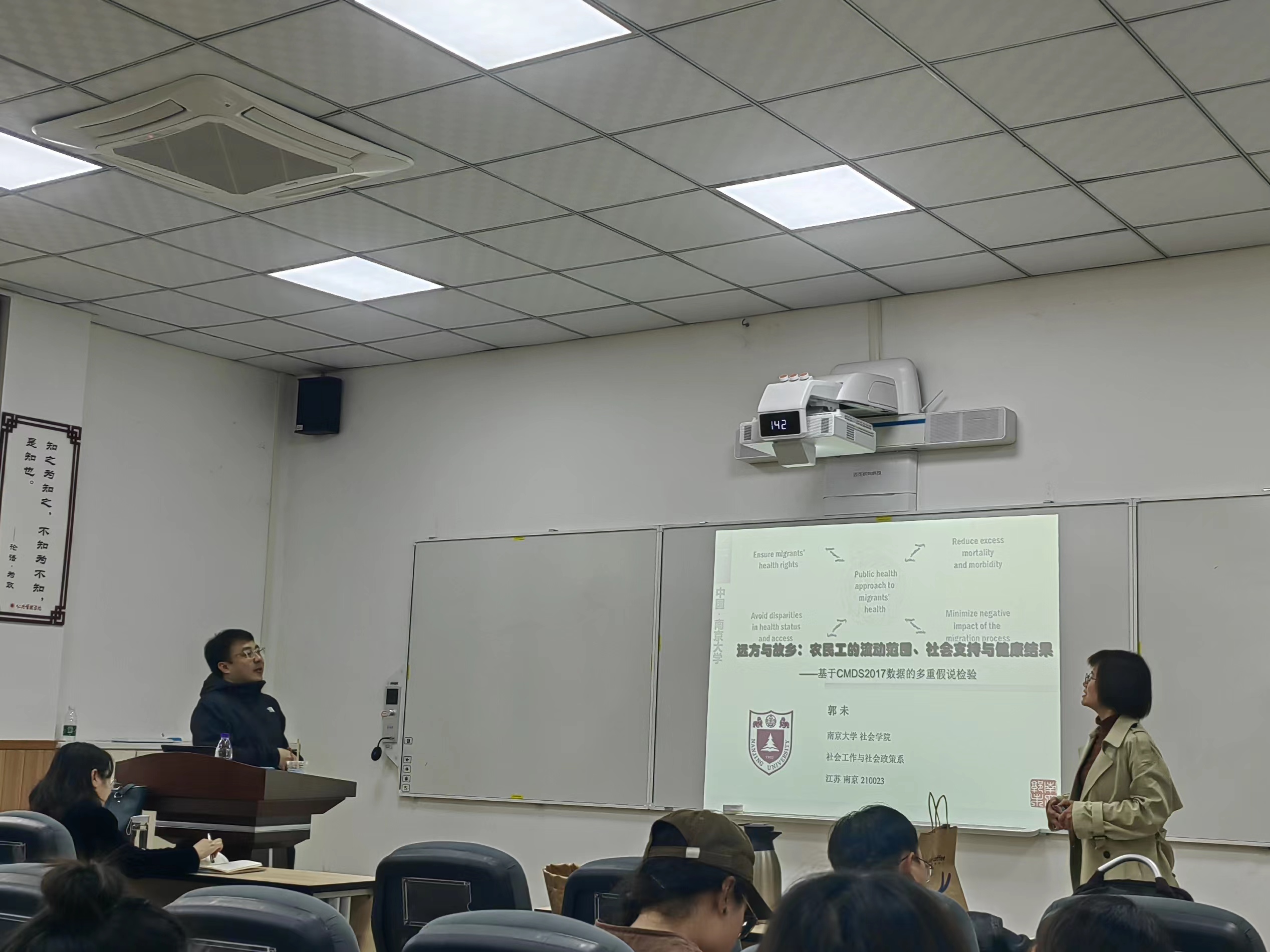 此外,与会老师们从概念、方法以及机制等角度出发提出建议,其中郑莉老师探讨了农民工的回流保障效应和回流选择效应、刘传军老师探讨了近年落地的政策与此研究之间的关系、陈勇老师结合周围亲友经历谈了对于流动人口健康的看法、张凌华老师表示对研究中涉及的人口地理空间问题非常感兴趣,同学们也踊跃提问互动,郭未教授对此进行了细致的回应与解答。