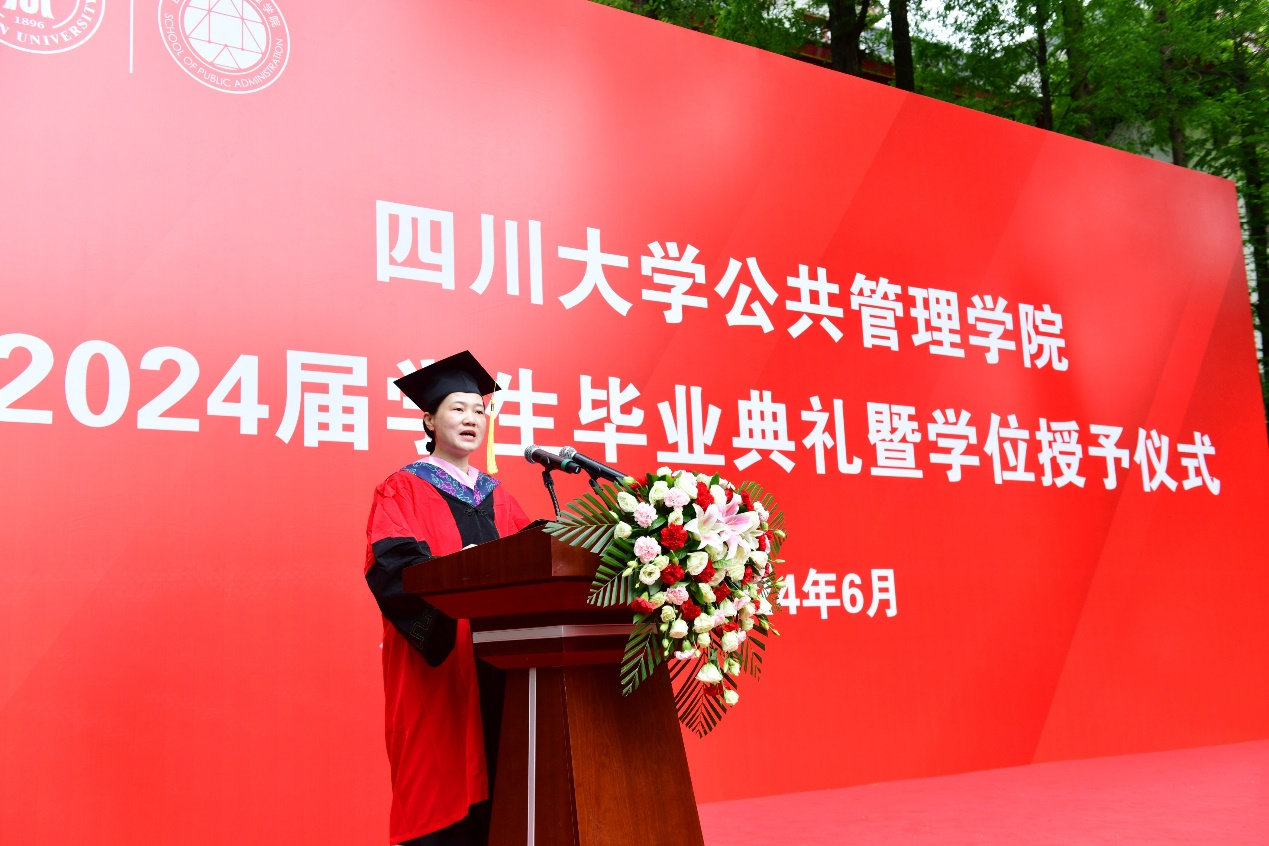 校友代表2012级行政管理硕士研究生、成都经开资本运营集团有限公司党委副书记张亚珠告诫学弟学妹,要在未来的学习和工作中着重培养自身的实践能力、反思能力和心理调适能力。无论遇到什么困难,都要忠于自己、善待他人;要常怀感恩之心,常念父母之恩、恩师之情、同窗之谊,并将感恩之心传递下去。