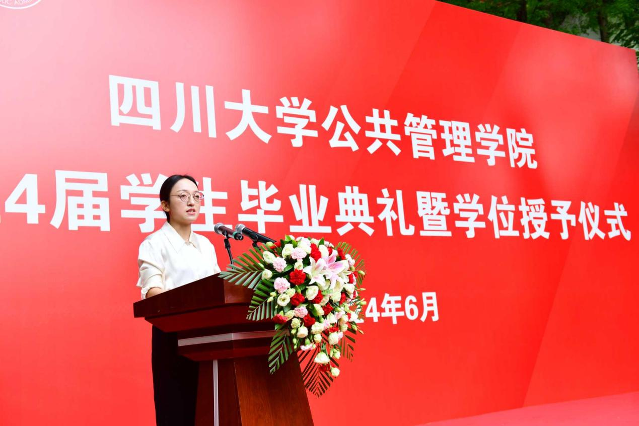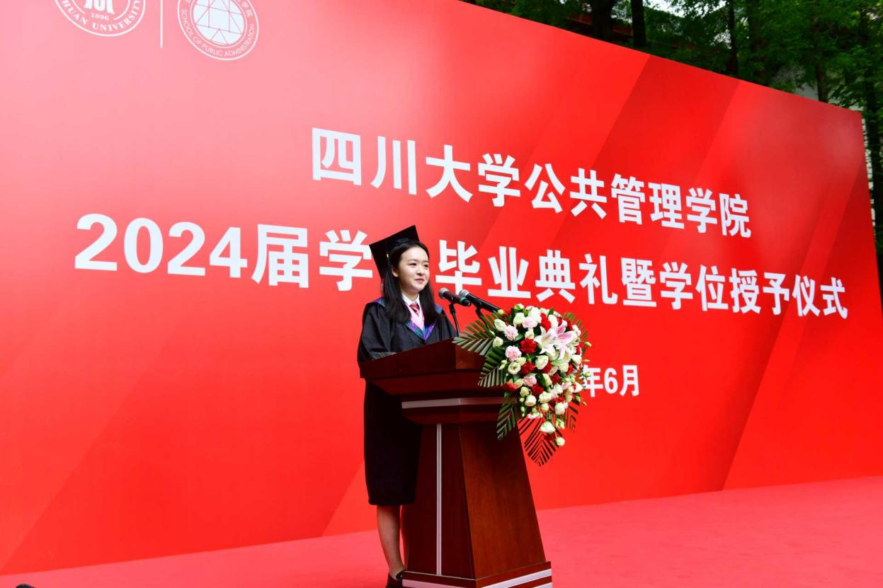 研究生毕业生代表江昕芮在发言中表示,在未来的日子里,将把在det365登录网站主页学到的知识贡献到国家发展和社会进步中。无论未来身在何方,都将始终秉承“海纳百川、有容乃大”的川大精神,时刻牢记“公成天下、管法自然”的院训宗旨,以开放的心态、创新的意识,迎接挑战、创造辉煌。