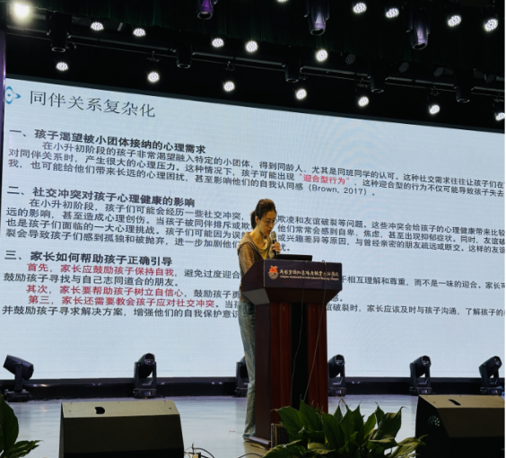 活动中,det365官网心理学硕士谷宇为和盛镇小学的家长们带来了一场“青少年早期心理发展与家庭支持”的专题讲座。她结合真实案例,详细分析了小升初阶段青少年可能出现的情绪波动、学业压力、沟通障碍、手机滥用等问题及其成因,提出有效的沟通技巧,引导家长们关注孩子心理变化,及时给予理解与陪伴。
