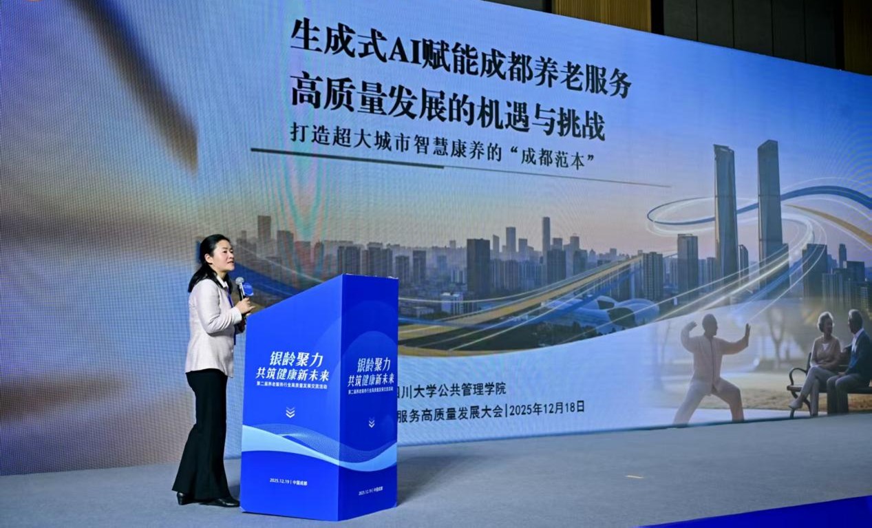 在主旨演讲中,中国人民大学人口与健康学院院长杜鹏教授以人口老龄化趋势与十五五时期养老服务改革发展为主题,结合人口数据与政策导向,剖析了未来养老服务改革的重点方向。罗亚玲教授以《生成式AI赋能成都市养老服务高质量发展的机遇与挑战》为题,从技术与治理深度融合的角度,探讨了生成式AI赋能成都市养老服务高质量发展的机遇,挑战与破解之道,即如何将生成式AI这一前沿科技转化为支撑成都市高质量养老服务的“新基础设施”,打造超大城市智慧康养的“成都范本”,为成都市养老服务数字化转型提供了兼具理论深度与实践操作性的政策建议。成都医学院潘克俭教授分享了老年健康领域数智人才培养的探索经验。成都中医药大学陈骥教授详细阐述中医药适宜技术在养老服务中的价值与推广路径。四川眉山药科职业学院卢敏校长则探讨了数智康养人才的产教融合创新实践。