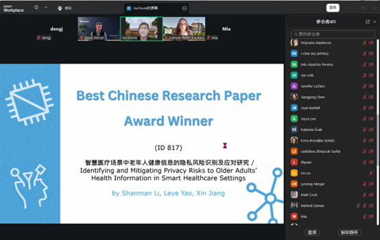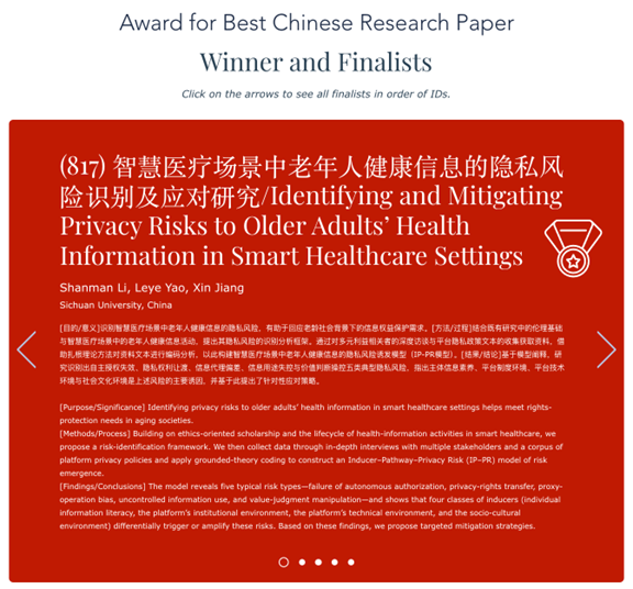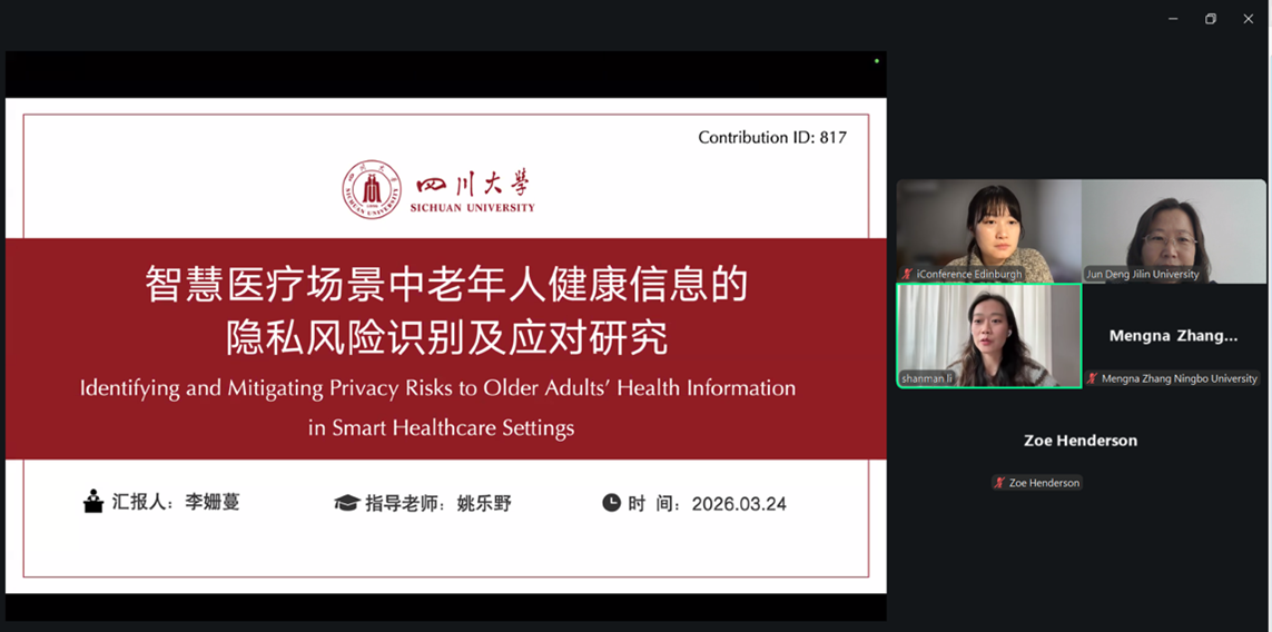 3月23日,信息资源管理领域国际顶级学术会议iConference 2026公布本年度最佳论文与最佳海报奖获奖名单。在姚乐野教授指导下,det365官网博士研究生李姗蔓与蒋欣合作完成的论文《智慧医疗场景中老年人健康信息的隐私风险识别及应对研究 / Identifying and Mitigating Privacy Risks to Older Adults’Health Information in Smart Healthcare Settings》荣获最佳中文论文奖(Best Chinese Research Paper Award),为该类别唯一最佳奖项。