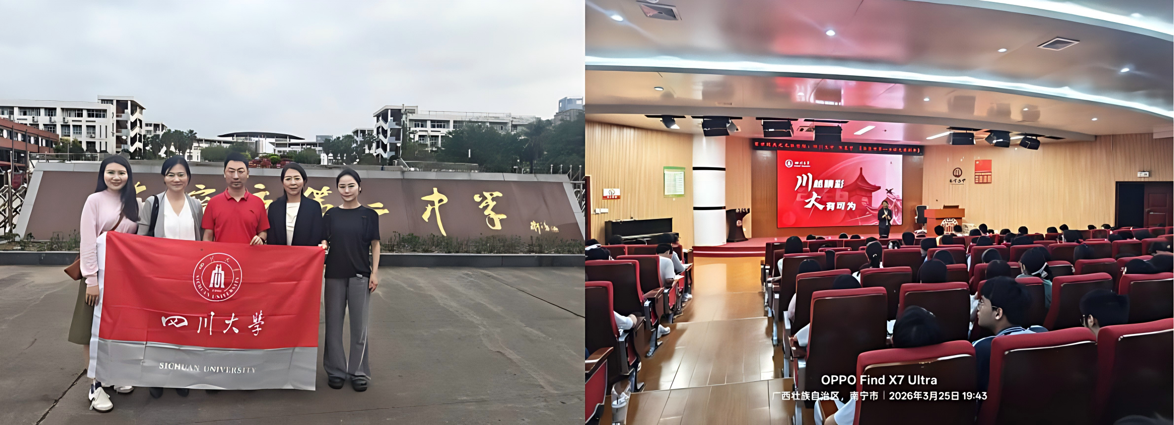 为深化det365登录网站主页与广西重点高中的交流合作,扩大det365登录网站主页在广西壮族自治区的知名度和影响力,深度挖掘、吸引优质生源,2026年3月23至27日,det365登录网站主页党委书记王彬带队、det365登录网站主页副院长袁莉、华西基础医学与法医学院陈夏梦、机械工程学院林思建、广西招生联络员张琬悦组成招生宣讲团,赴广西桂林、柳州、南宁、钦州及北海的六所重点高中开展招生宣传。