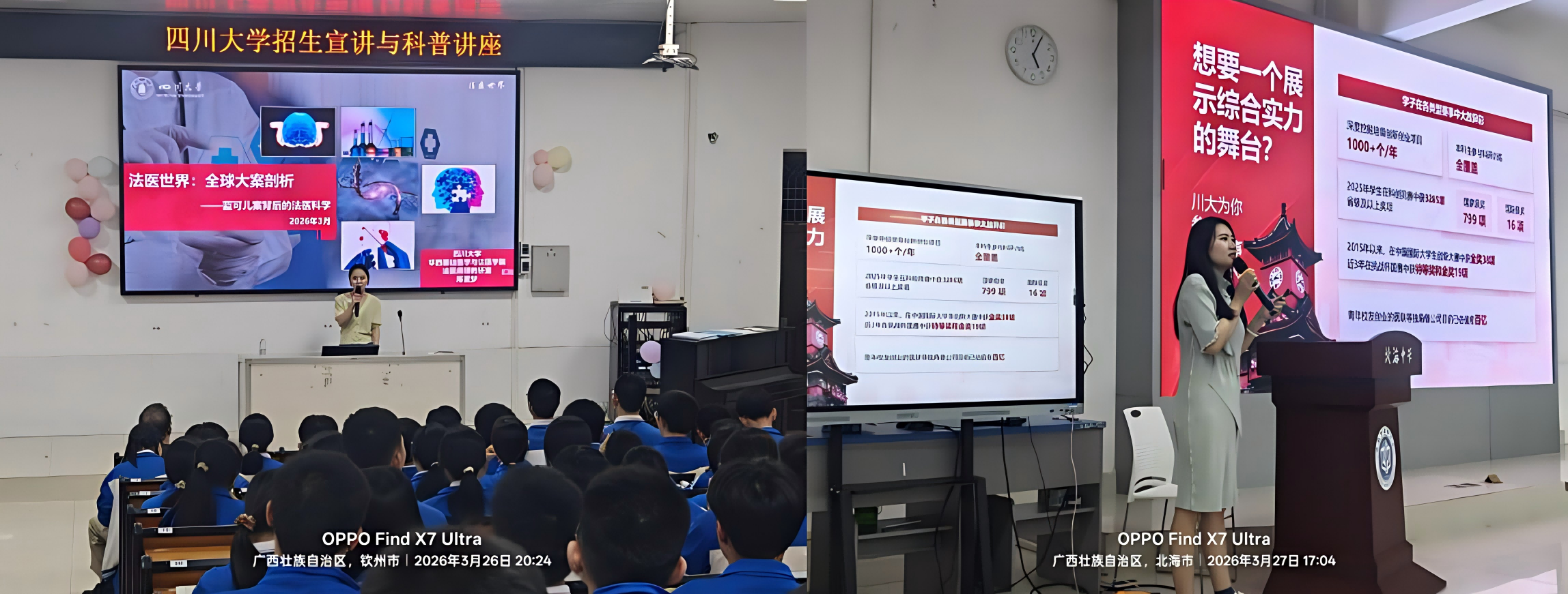 3月26日-27日,招生宣讲团前往钦州二中及北海中学,与校领导、教务主任进行交流,并面向高三重点班同学开展活动。陈夏梦老师为学生带来科普讲座,张琬悦老师进行了川大校情、校策宣讲。报告厅座无虚席,同学们认真听讲,汲取知识的营养,感受大学课堂的魅力。