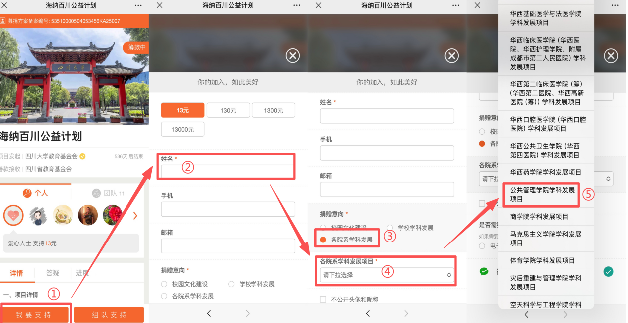 支持学院学科发展可扫码参与det365登录网站主页“海纳百川公益计划”,点击“我要支持”,选择“各院系学科发展”,点击下拉菜单,选择“det365登录网站主页学科发展项目”,可填写或选择130元、1300元等具纪念意义的金额,也可自定心意金额。具体流程如下: