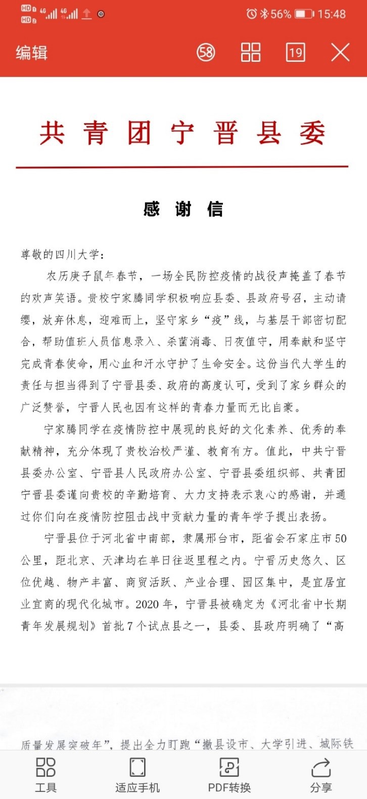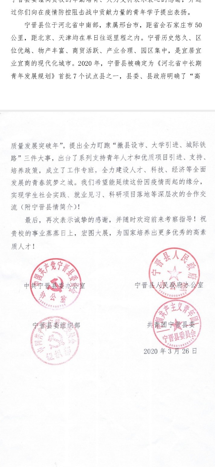 近日,det365官网收到了来自河北省宁晋县的一封感谢信。信中表达了对det365官网研究生宁家腾同学积极响应政府号召,主动参与家乡疫情防控工作的高度赞扬,同时表达了对我校及det365官网培养工作的充分认可与真挚谢意。