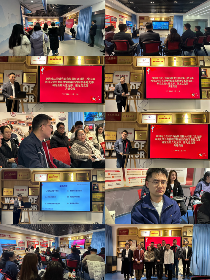 为扎实推进一流党支部、一流党员队伍建设,着力构建“一融双高”工作体系,12月20日上午,学院秘书档案学系党支部、研究生第六党支部、研究生第九党支部十余位同志赴四川电力设计咨询有限公司(四川院)同其第二党支部开展共建交流活动。
