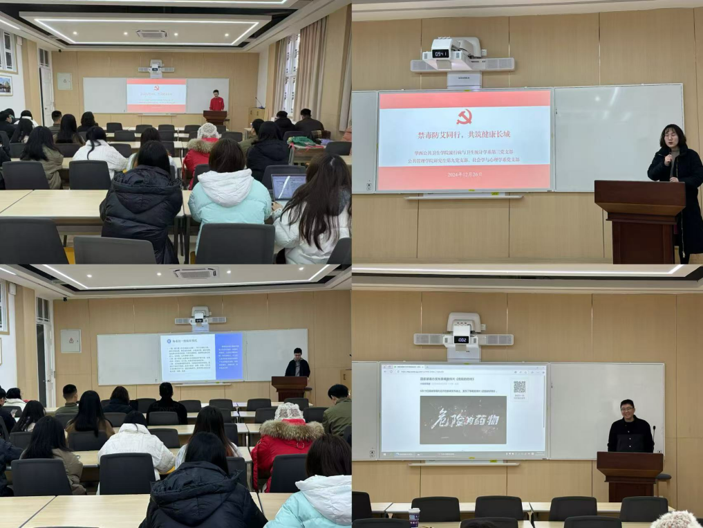 12月26日上午,det365登录网站主页社会学与心理学系党支部、研究生第九党支部与华西公共卫生学院流行病与卫生统计学系第三党支部在det365登录网站主页206室联合开展“禁毒防艾同行,共筑健康长城”主题党日。本次活动由华西公共卫生学院流行病与卫生统计学系第三党支部党员吴祥瑞同志主讲,学院党委委员、社会学与心理学系党支部书记李诗颖副教授,徐文健副教授等三十余位同志参与了本次活动,秘书档案学系党支部书记、系副主任赵跃副研究员受邀出席。活动由学院研究生第九党支部书记孟焕主持。