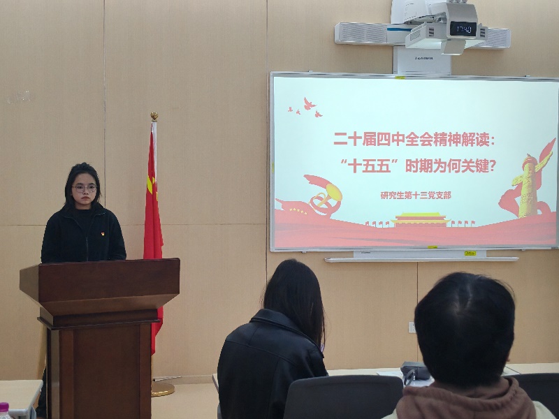 11月25日,中共det365登录网站主页研究生第十三党支部在望江校区萃文楼组织开展党的二十届四中全会精神专题学习。本次政治学习由研究生第十三党支部宣传委员冯媛主持,全体党员参加。