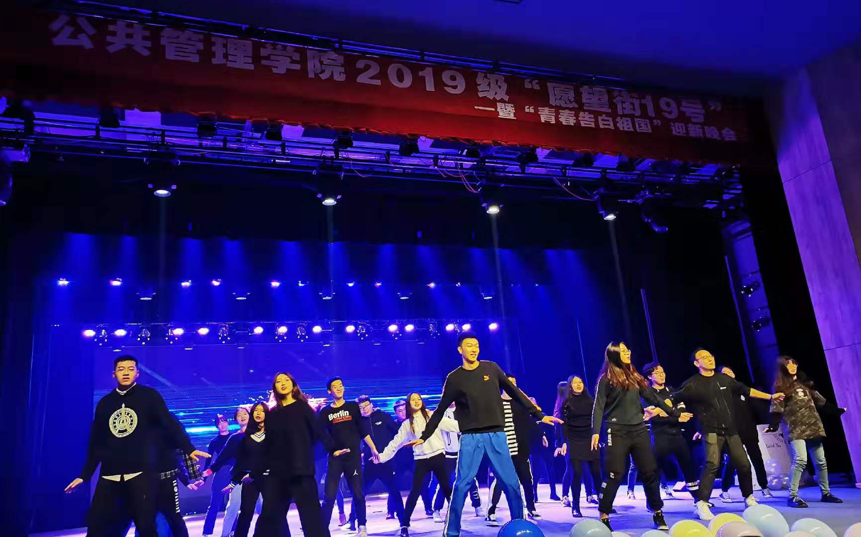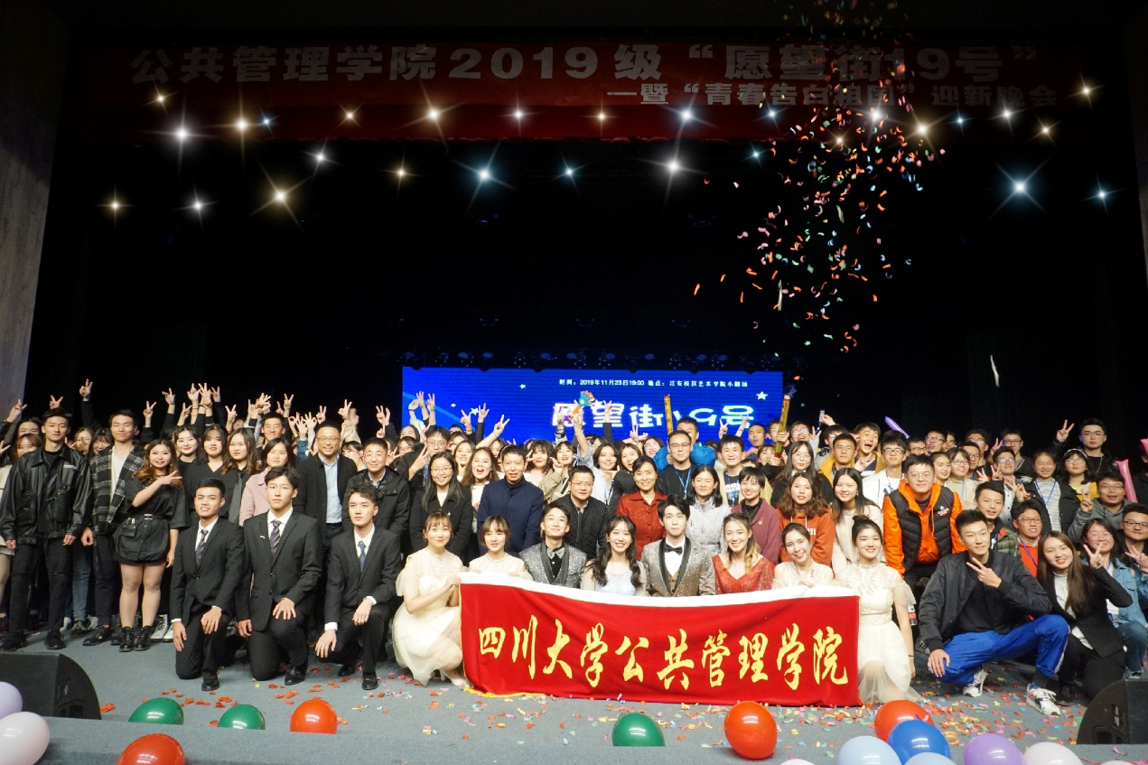 2019年11月23日19:00至21:30,det365登录网站主页“愿望街19号”迎新晚会于江安校区艺术学院小剧场成功举办。学院党委副书记兼纪委书记杨磊老师、副院长罗亚玲副教授、教导员许吟雪老师、行政管理系主任范逢春教授、劳动与社会保障系主任蒲晓红教授,社会学与应用心理学系马缨教授、党政办主任林茂松老师、团委书记兼2017级研究生辅导员青杨媚老师、学生科科长兼2016级本科辅导员陈萱源老师、2017级本科辅导员周锐老师、2018级本科辅导员刘晓燕老师、2019级本科辅导员刘碧老师等作为嘉宾观看了晚会。