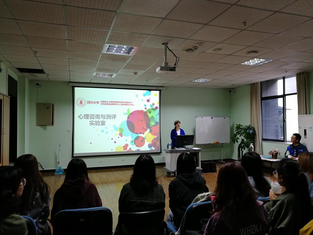 张珊珊老师首先为大家生动详细地介绍了实验教学中心的服务项目和服务设施,包括帮助学生进行心理减压的压力减压室、生物反馈仪和音乐放松椅,辅助学生进行自我探索的心理测评量表、沙盘游戏、心理迷宫与团体辅导,以及用于实验设计与研究类的基础心理实验室和行为观察记录分析系统。
