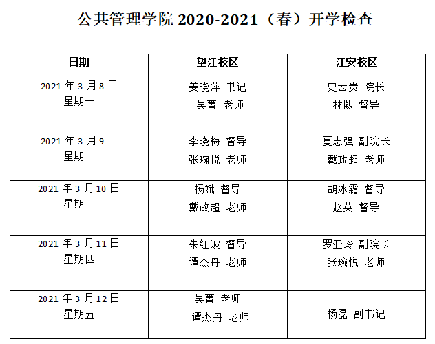 1、学院提前制定开学教学检查一周工作安排表,做到望江、江安两个校区全覆盖,并将开学教学检查责任落实到个人,全院正副职院领导、本科教学督导组成员、本科教务秘书、本科教学管理人员等参与检查。学院党委书记姜晓萍、院长史云贵、副书记杨磊、副院长夏志强、副院长罗亚玲,本科教学督导组胡冰霜、杨斌、赵英、朱红波、李晓梅等老师、本科教务秘书林熙老师以及本科教学管理人员吴菁、戴政超、谭杰丹、张琬悦等对新学期的课程安排与上课情况进行了检查。开学检查分设望江校区和江安校区两个部分,以下是det365官网制定并依之执行的开学教学检查安排表: