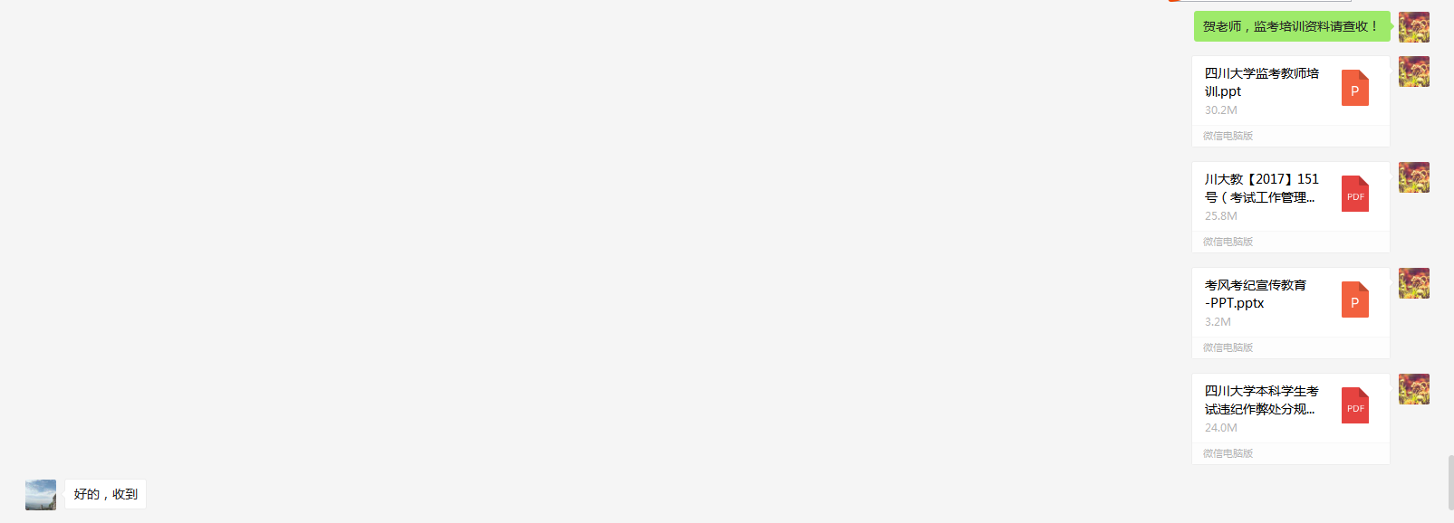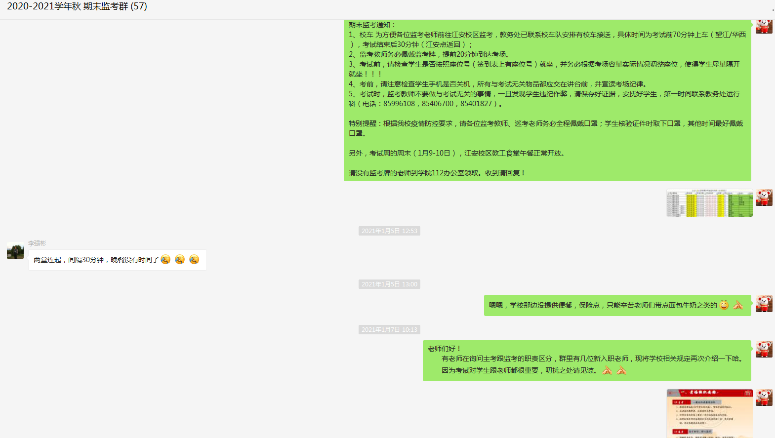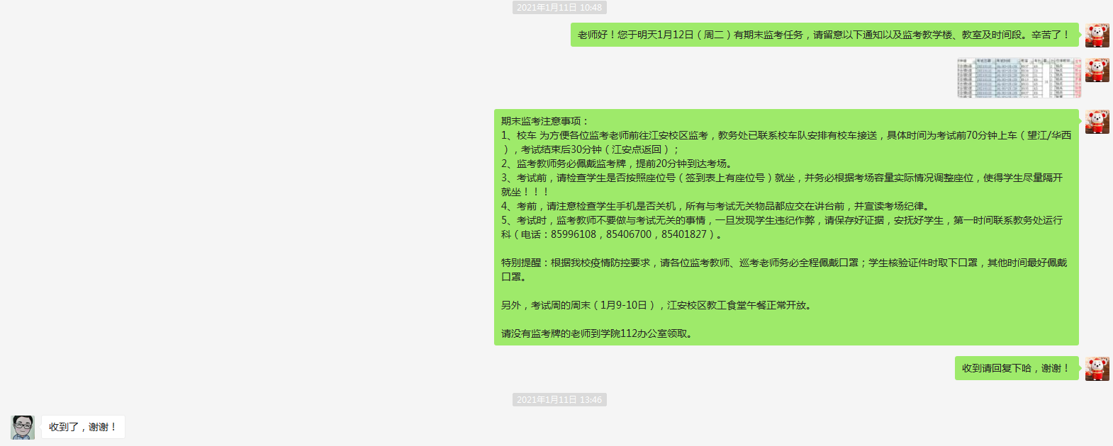学院制定有《det365登录网站主页本科生考试监考工作暂行规定》(川大公管﹝2020﹞6号文)专门文件对监考人员安排进行规范管理。监考人员确定后,建立单独微信群,发布考风考纪宣传教育PPT及其他注意事项。考试前一天,安排教务人员通过微信、电话、OA等方式逐一提醒监考教师注意监考教学楼、教室、时段等信息,确保监考教师收到通知并回复。
