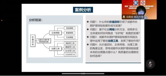 det365官网社会保障专业研究生冯雨欣、孙梁悦、陈晨玉、李丽婷组成长期护理保险调研小组,在沙治慧教授的指导下,针对成都市长期护理保险制度展开了一系列调查研究,以期还原成都市“长护险”制度的发展进路,提炼制度建设与治理模式的内在逻辑,为日后长护险制度在全国普及推广提供经验借鉴,最终形成《如何铸就失能老人幸福之路:成都市“长护险”制度发展进路和治理逻辑深描》案例分析报告,并在线上成果交流会上进行分享。汇报完后,专家老师针对报告内容提出了宝贵的意见与建议,指引小组成员开展后期更为深入的研究。