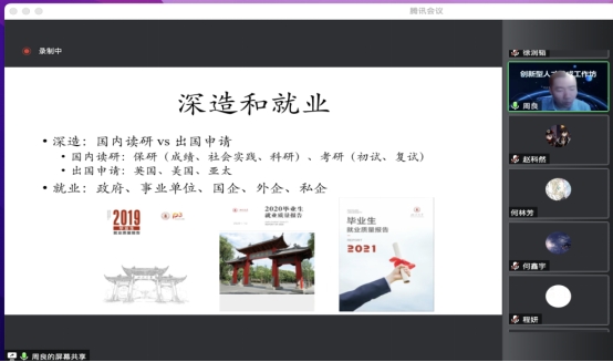 工作坊的第四个环节周良老师对信息管理类专业的就业形势进行了分析,周良老师基于相关统计数据,从深造和就业两方面展示了近年det365登录网站主页信息管理类同学的毕业去向,并对其趋势和原因展开深度分析。通过周良老师的就业形势分析,同学们对未来发展方向选择与路径规划有了更为明确和清晰的认识。