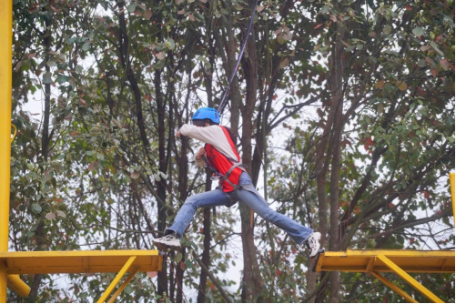 团队展示环节之后,共有“高空断桥”、“极速拼接”、“争分夺秒”、“毕业墙”四项活动。在“高空断桥”活动中,每位同学需要独自走上8米高的“断桥”进行跨越,通过互相加油助力,同学们增强了挑战自我得到的勇气和快速适应的能力。在“极速拼接”游戏中,三个小组在组内自行分为指挥组和操作组,通过紧密配合、快速操作,均成功将16根不规则木条按照图纸拼接完成。在“争分夺秒”游戏中,同学们以小组为单位首先将图片代表的数字解密,再在规定时间内按照顺序正确排列,获得了教练团队的连连肯定。在攀登“毕业墙”的过程中,同学们齐心协力搭建“人梯”,在不借助其他工具的情况下成功翻越一堵4米高的墙壁,更加深刻地体会到了团队信任、拼搏尝试的力量。