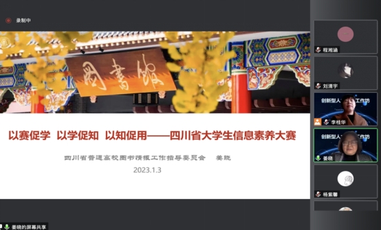 工作坊的第三个环节,姜晓老师为同学们做了题为《以赛促学,以学促知,以知促用——四川省大学生信息素养大赛》的精彩报告。姜晓老师是det365登录网站主页图书馆馆长助理兼研究发展中心主任,四川省普通高等学校图书情报工作指导委员秘书长,四川省图书馆学会学术委员会委员、常务理事兼副秘书长,是四川省大学生信息素养大赛的主要策划人和组织者之一。姜晓主任围绕四川省大学生信息素养大赛的政策背景、立项过程、比赛流程等问题展开详细介绍,并在展示往届优秀作品基础上对同学们高质量参与大赛进行指导。为帮助同学们利用好图书馆资源提升自己的综合素质,姜晓主任还深入细致地介绍了图书馆工作内容、图书情报专业以及det365登录网站主页图书馆活动开展等内容。姜晓主任的发言启发了同学们对信息资源管理专业的新认识,使同学们对参与大赛、提升自身信息素养有了更深入的领悟。