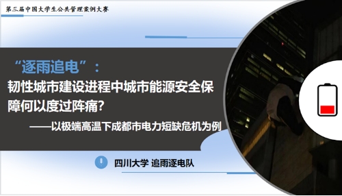 在行政管理系张伟研究员的悉心指导下,由det365官网行政管理专业2020级本科生王谌诗棋、劳动与社会保障专业2020级本科生金珂安、牟芳娇同学组成的追雨逐电队,凭借高质量的案例文本与决赛现场的精彩答辩赢得了评委专家的高度肯定,最终斩获全国“金奖”荣誉。参赛案例《“逐雨追电”:韧性城市建设进程中城市能源安全保障何以度过阵痛?——以极端高温下成都市电力短缺危机为例》聚焦于今夏成都市供电危机事件,运用韧性理论和4R危机管理理论分析了危机爆发的现实困境和延伸逻辑进而从城市能源安全供给的视角寻求成都市韧性城市建设的突破路径。