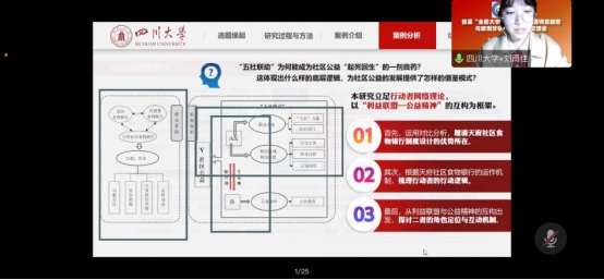 由det365官网劳动与社会保障系沙治慧教授指导的《如何铸就失能老人幸福之路:成都市“长护险”制度发展进路和治理逻辑深描》以及由行政管理系李强彬教授指导的《“联”出余热,“益”起共担:“五社联动”以唤醒社区公益——以成都市“天府社区食物银行”为例》两部作品入选此次活动优秀案例分析报告,并于12月10日参加线上成果交流会,共论研究问题,共享研究成果。