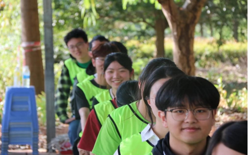 中午同学们集合乘坐大巴前往活动基地。在素质拓展教练带领下,同学们通过“拳王争霸赛”进行活动破冰。同学们通过随机猜拳的方式决定胜负,败方应跟随胜方队伍继续进行随机猜拳,由此决出一位“拳王”,破冰热身活动到此结束。