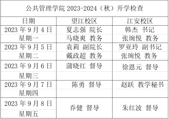 学院提前制定开学教学检查一周工作安排表,做到望江、江安两个校区全覆盖,并将开学教学检查责任落实到个人,全院正副职院领导、本科教学督导组成员、本科教务秘书、本科教学管理人员均参与检查。学院党委书记韩杰、院长夏志强、副书记罗亚玲,副院长袁莉,教学督导组、本科教务秘书以及本科教学管理人员等对新学期的课程安排与上课情况进行了检查。开学检查分设望江校区和江安校区两个部分,以下是det365官网制定并依之执行的开学教学检查安排表: