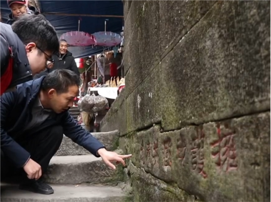 图为团队成员在恩阳古镇内阅读一处红军石刻标语