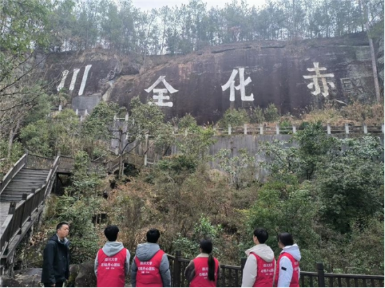“赤化全川”标语位于沙溪镇红云崖高25.9米的悬崖峭壁之巅,字幅高5.85米,宽53米,字幅面积为310.05平方米,紧邻全国最大的红军烈士陵园——川陕革命根据地红军烈士陵园。2013年前后,当地为“赤化全川”标语原址修建了栈道与观景台,并在对面山头修建了一处眺望台,供当地居民与来往游客驻足瞻仰。团队成员认真聆听王坪烈士陵园讲解员标语背后的故事,感受军民同心、共克时艰的革命伟力。