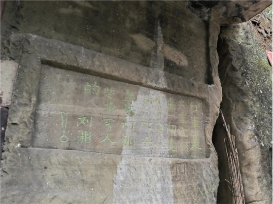 图为卡门坡红军石刻标语原址(石刻记载内容为:红军是共产党领导一切是维护穷人,维护士兵,坚决打那些振穷人的人刘湘杨森)