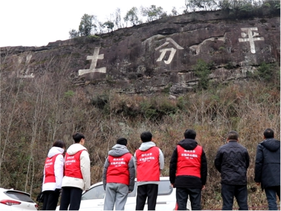 图为团队成员环视平梁镇马家河红军石刻标语碑