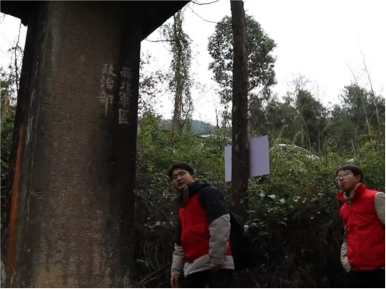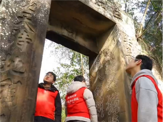 图为团队成员在巴州区清江镇禹王宫红军石刻标语原址