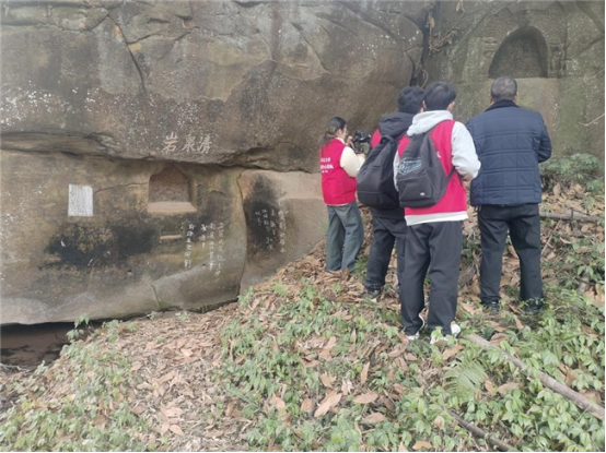 图为团队成员在巴州区清江镇清泉岩红军石刻标语原址