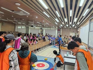 相较于汉诺塔,旱地冰壶项目则更侧重于策略布局。在模拟的冰壶赛道上,师生们轮流掷壶,目标是将己方的壶推向营垒中心,同时巧妙设置障碍或撞击对手的壶。在欢声笑语中,师生们提升了集体荣誉感,在对抗与合作中感受团队的力量。
