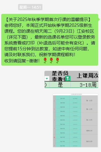 学院教务管理人员提前核查教学任务、课表,并至少提前一天以电话、短信、微信、QQ等方式通知老师们做好教材、授课等教学准备,确保老师们知晓正式上课的时间、地点。提醒上课的教师提前15分钟到达教室,确定教室多媒体等教学设备正常使用,保证教学正常运行。