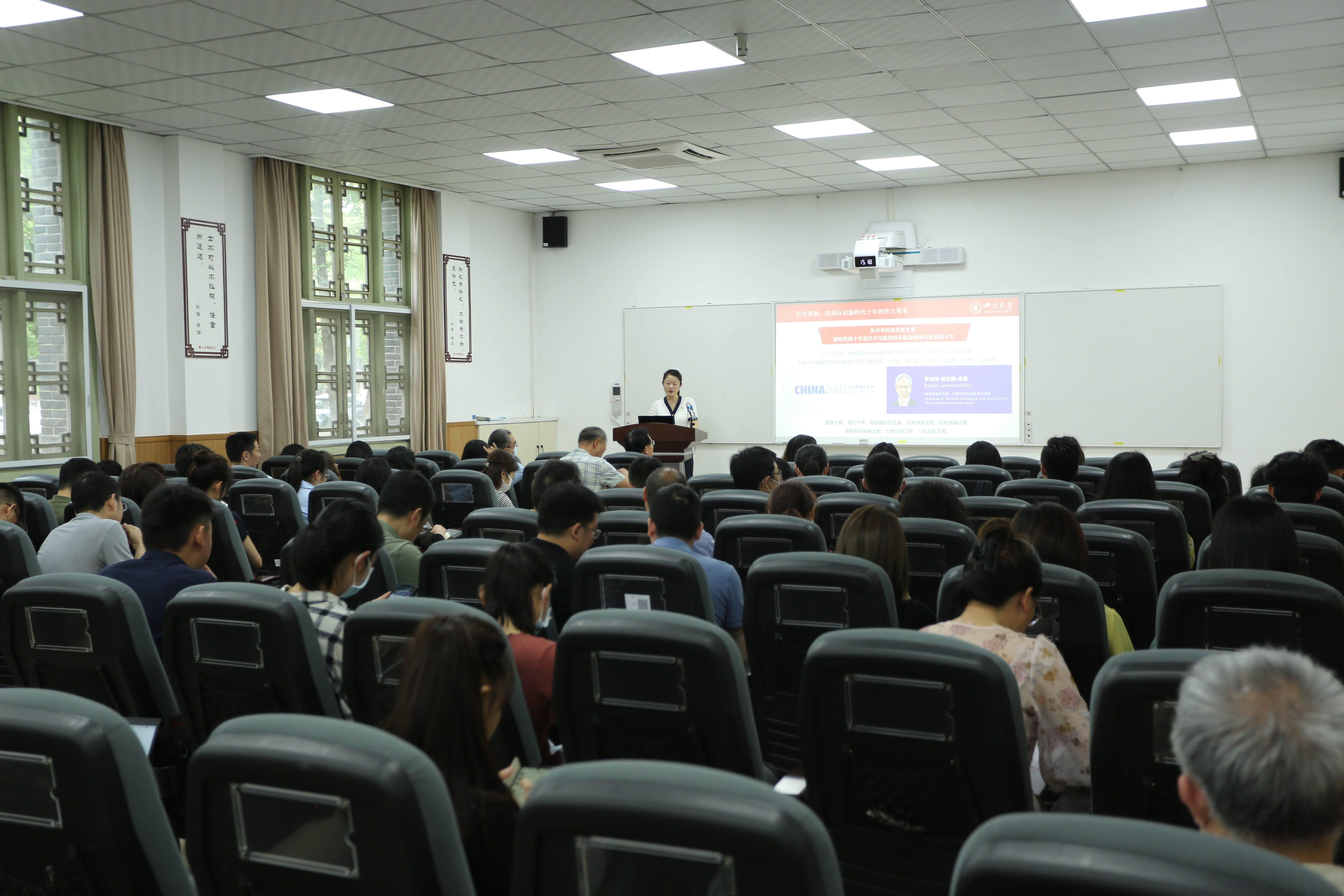 5月19日,为持续深入推进学习贯彻习近平新时代中国特色社会主义思想主题教育,进一步做到学深悟透,det365登录网站主页在萃文楼举办学习贯彻习近平新时代中国特色社会主义思想主题教育理论学习专题报告会。学院班子全体成员,学校有关部处领导,学院两委委员,专职组织员,系主任,支部书记兼副系主任,各科室负责人,教工党员代表,学生党员代表,师生群众代表100余人参加学习。报告会由学院党委书记韩杰主持。